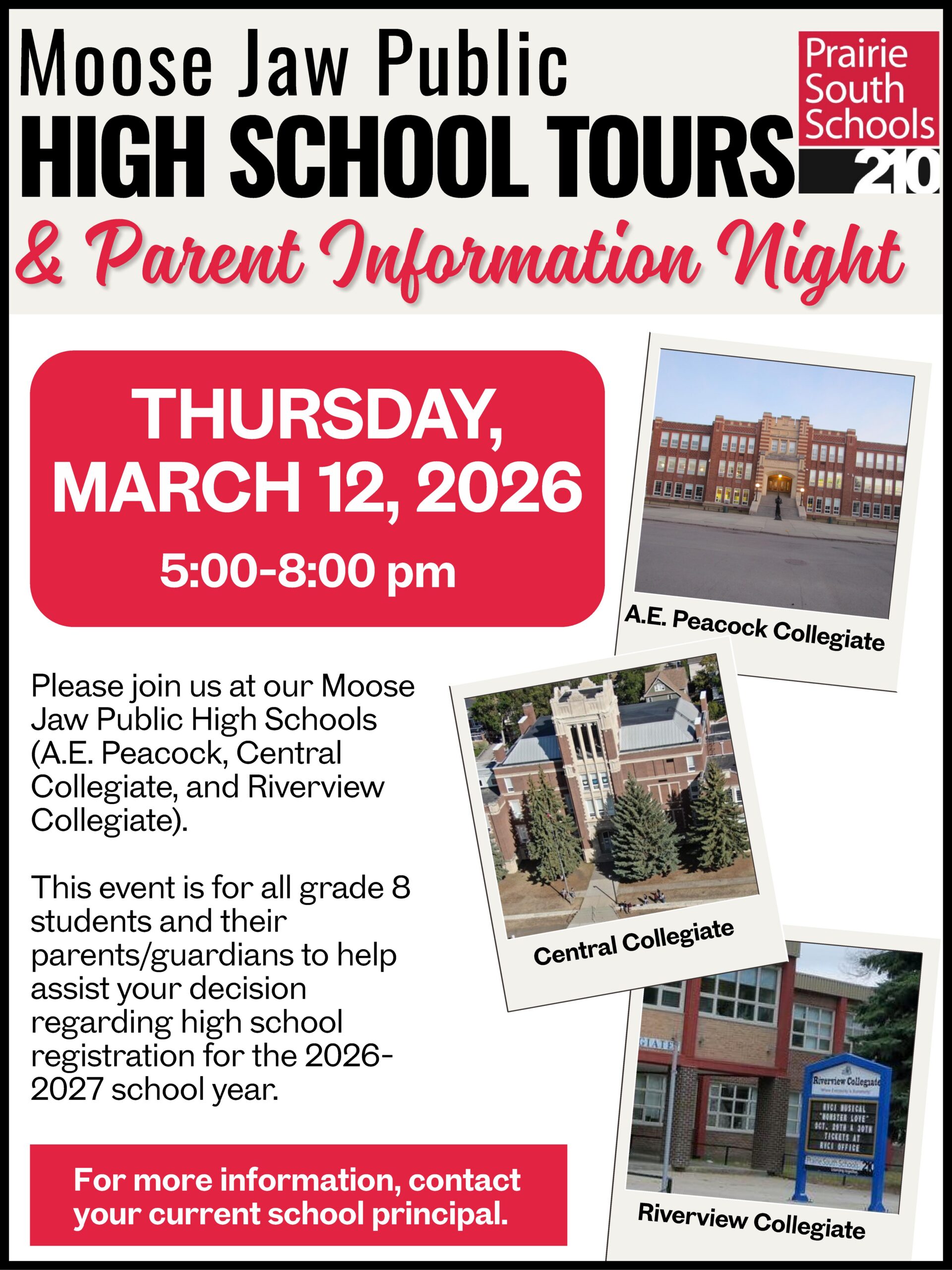Tours of the Moose Jaw Public High Schools will take place on Thursday, March 12. see poster for more details Categories: Division, Learning, Parents, Staff, StudentsFebruary 24, 2026 Share this post Share on FacebookShare on Facebook Share on XShare on X Post navigationPreviousPrevious post:The Incredible Years Parenting ProgramNextNext post:Save The Date!You may also like...Special Board MeetingMarch 19, 2026Save The Date!February 24, 2026The Incredible Years Parenting ProgramJanuary 7, 2026Coteau Hills Elementary School – Community Open HouseOctober 8, 2025William Grayson School Celebrates 100 Years!September 9, 20252025-2026 Postsecondary and Career Google ClassroomSeptember 9, 2025